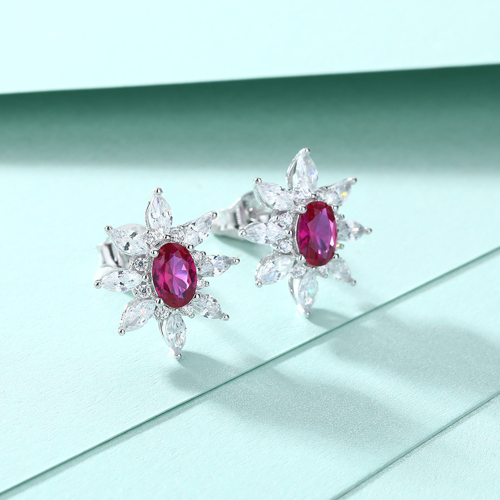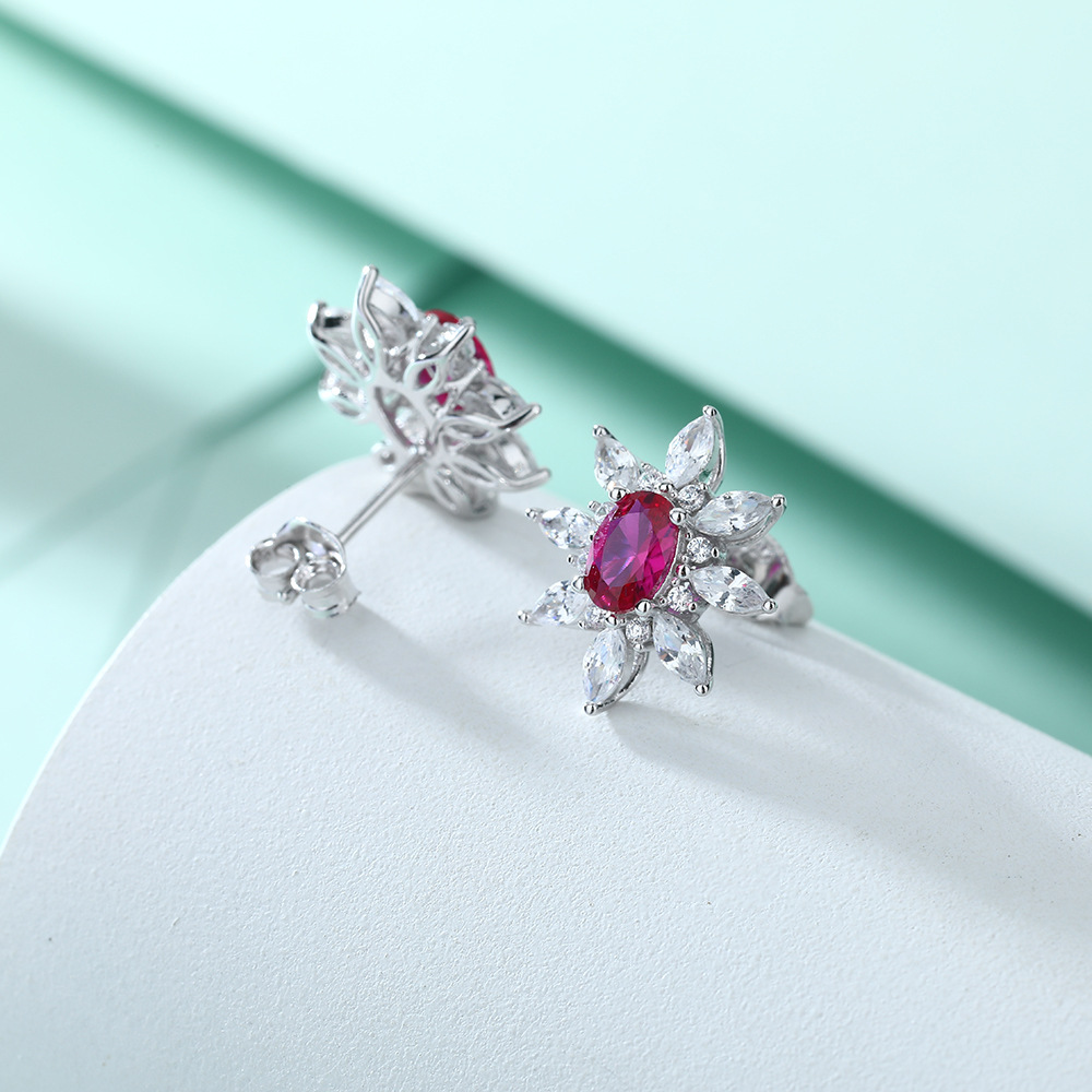 S925 Silver Sunflower & Eight-Pointed Star Ruby Earrings for Women – Elegant Floral Jewelry