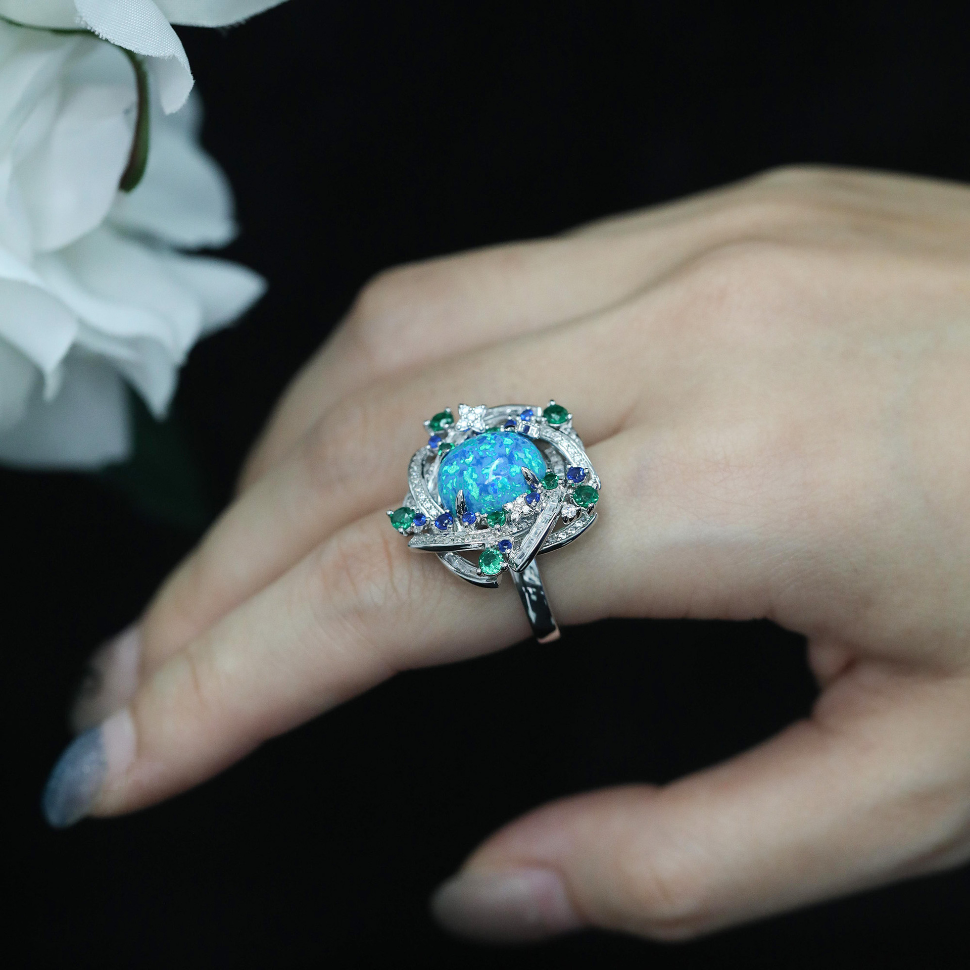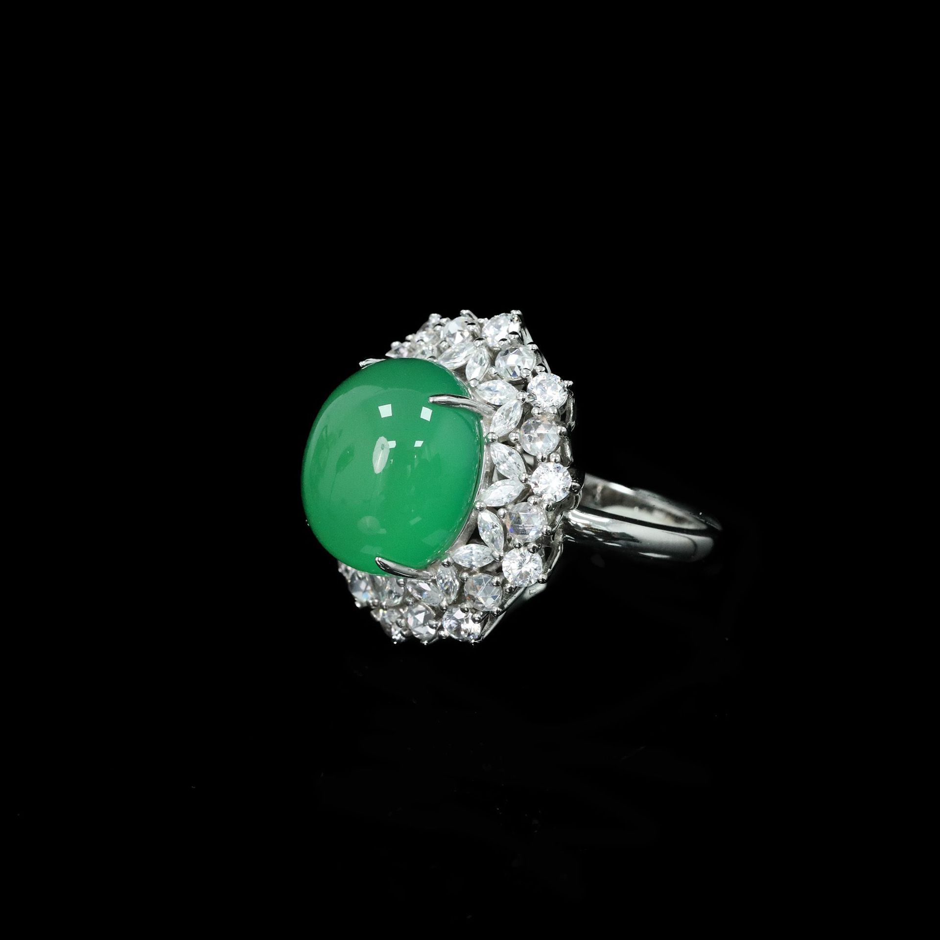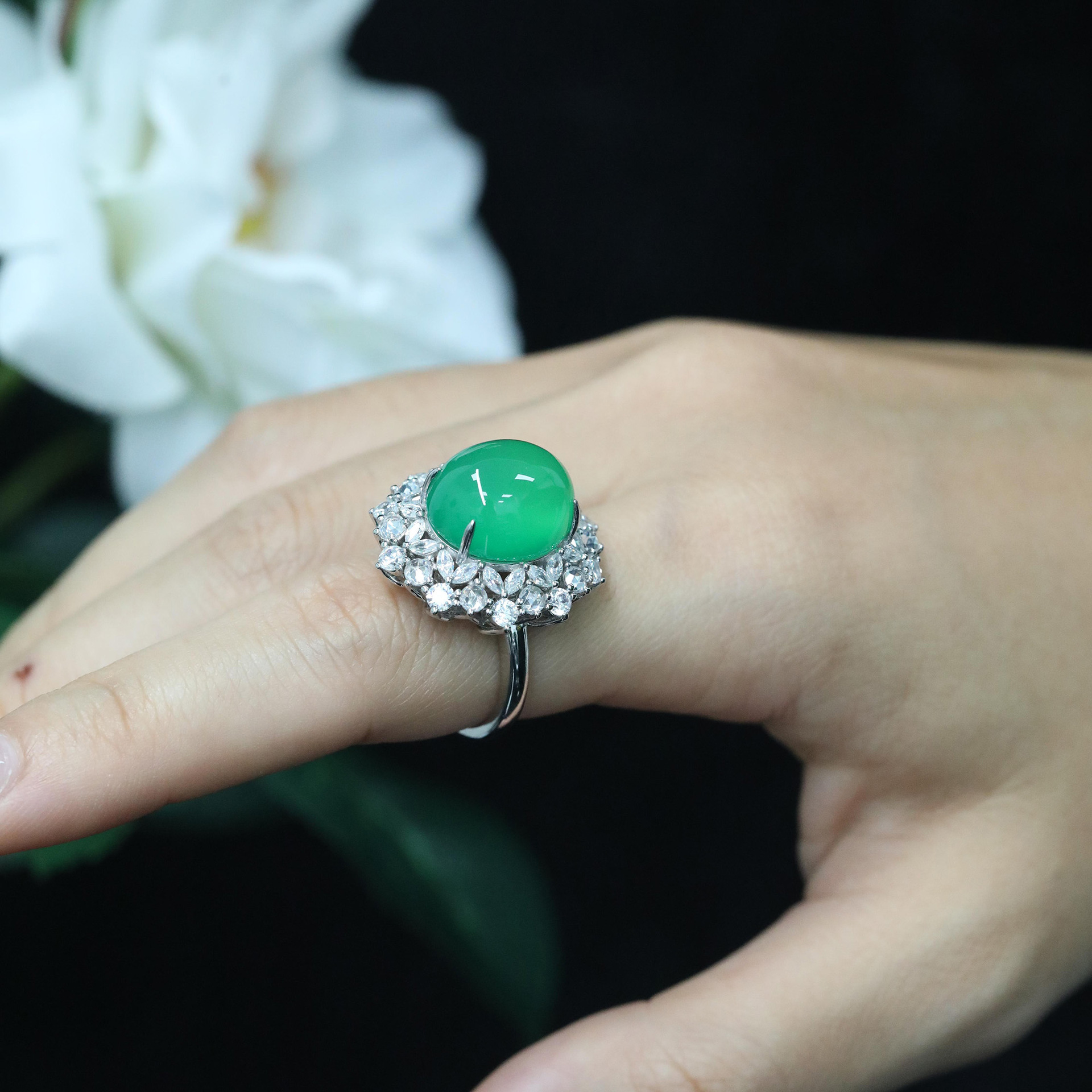 925 Silver Gold-Plated High Carbon Diamond Egg-Shaped Chalcedony Flower Ring