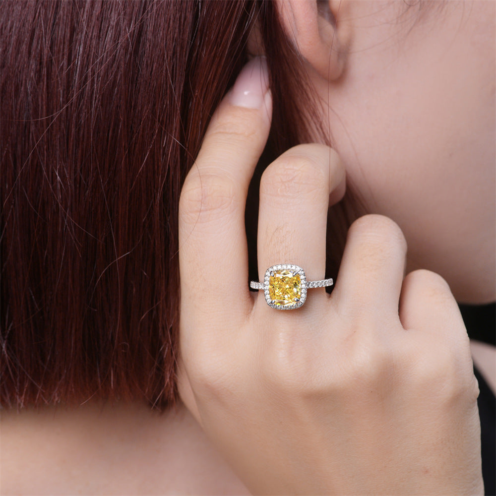 Elegant S925 Sterling Silver 3 Carat Yellow Ice Flower Cut Ring with 8*9 High Carbon Diamonds