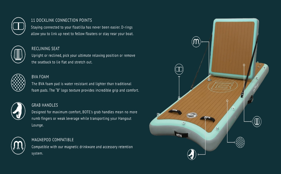 - Included Items: One (1) Inflatable Hangout Lounge. One (1) Inflatable Back Support. One (1) Hand Pump. One (1) Carry Sling. Set of four (4) DockLink Connectors